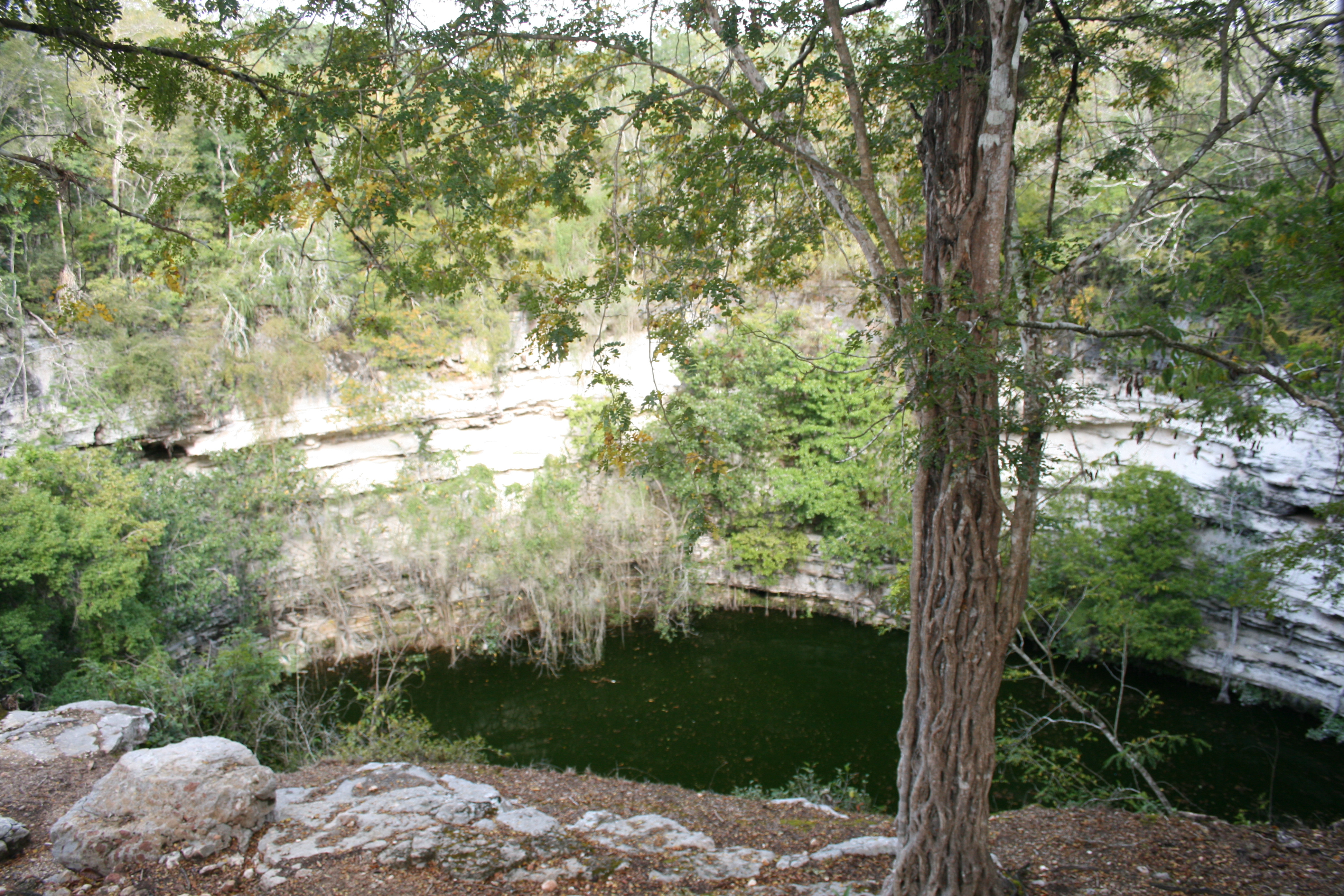 Why did the Mayan civilization shift its center of gravity to the northern Yucatán during the Post-classic period? What allowed these cities to prosper and grow while the southern lowlands were abandoned? At first glance climate and environment would have seemed to have worked against the northern Yucatán. It has much less precipitation than regions to the south such as Tikal and a drier, less verdant vegetation cover. The limestone bedrock is porous and water quickly disappears from the surface. However, these northern Mayan sites show much evidence of the use of groundwater resources rather than surface reservoirs. These include small water catching subterranean basins and large sink holes – called cenotes. A prominent feature at Chichen Itza is the Cenote Sagrado (sacred cenote). Perhaps the early adaptation of the Maya here to aridity created by the drier conditions of the northern Yucatán coupled with reliance on ground water, rather than evaporation sensitive above ground reservoirs was important in sustaining Mayan urban culture in the Yucatán?